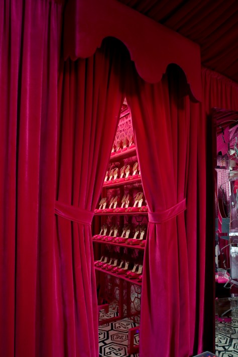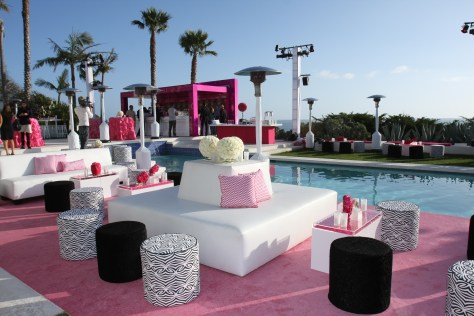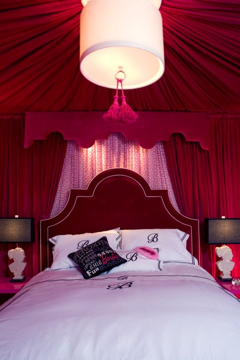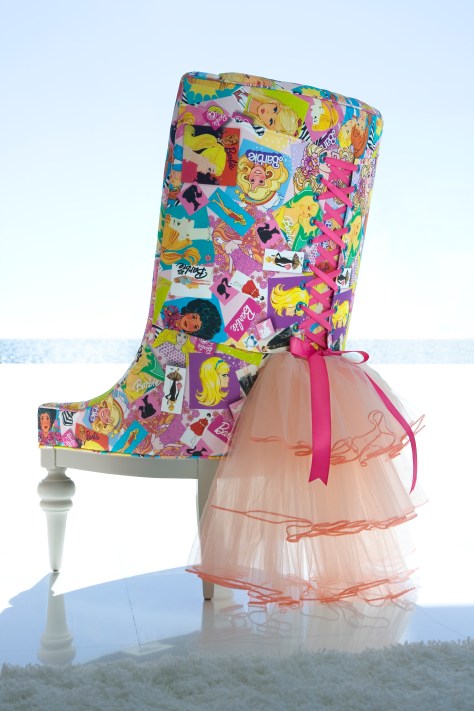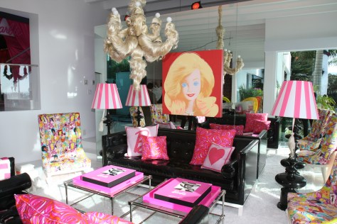 4. Me encanta el plotter que hay en la pared del fondo del tocador, una reproducción gigante de dibujos de Barbie peinándose, y me encanta el sillón, pero sin ese tul que le pusieron colgando por detrás. Desde luego, esto sí que es «Barbie madness»