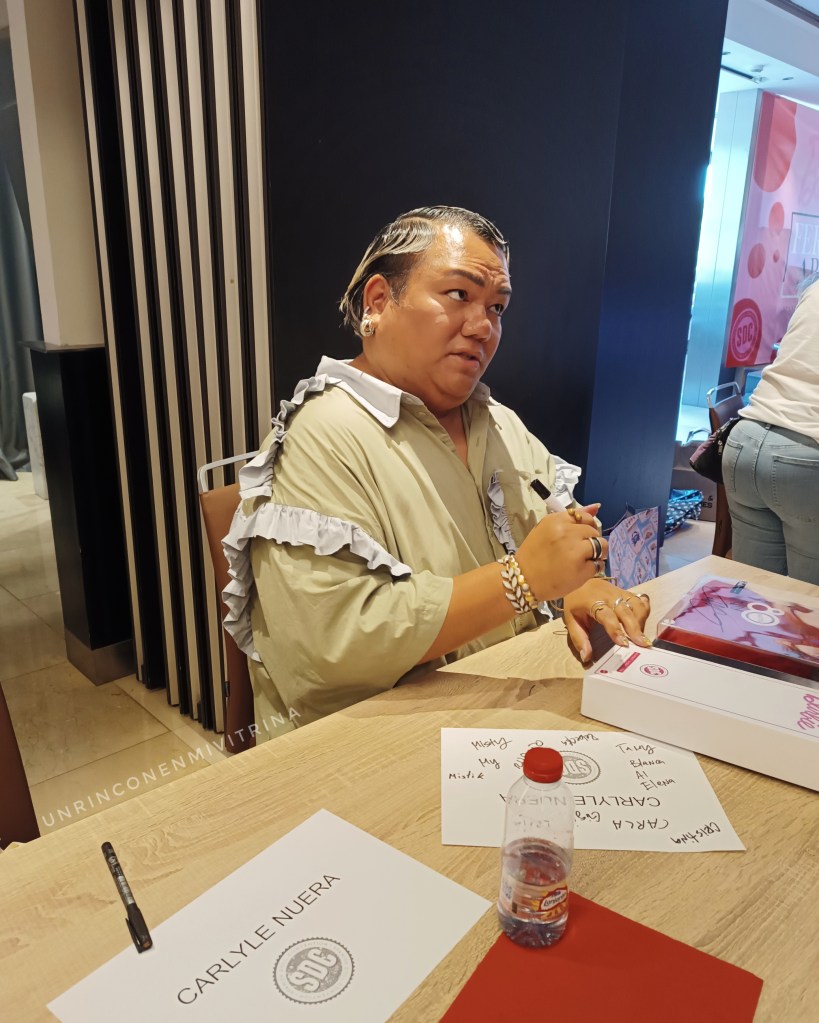 Al ver esta imagen recordé que tenía el pack de ese vestido aquí sin sacar de la bolsa (un regalo de quien vosotros sabéis) y con algo de vergüenza fue lo que llevé. ¡A Carlyle le hizo mucha ilusión! Le sorprendió mucho y me explicó que lo había diseñado él (como si yo no supiera jajaja) y cruzamos varias palabras. Por supuesto me volví con una foto con él (unas cuantas por si acaso). Me sorprendió que fuera tan cercano y alegre aunque, sinceramente, es como me lo había imaginado en mi cabeza.