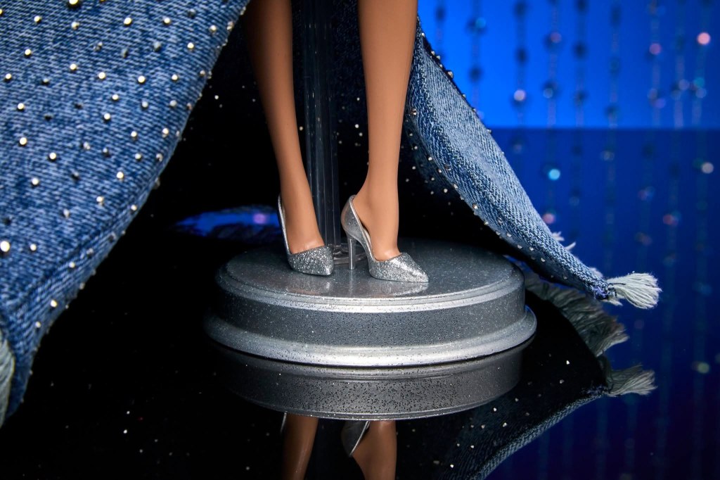 El increíble vestido que luce Barbie está creado con 51 piezas de tejido denim unidas con la técnica patchwork y un montón de cristales que la hacen brillar como si fuera una auténtica estrella en la alfombra roja. ¡Atención al lazo! Me encanta su actitud. El peinado, el maquillaje, ¡esos ojos!, los accesorios… todo en ella está cuidado. Perfecta para una convención que lleva por nombre Superstar Dreams.