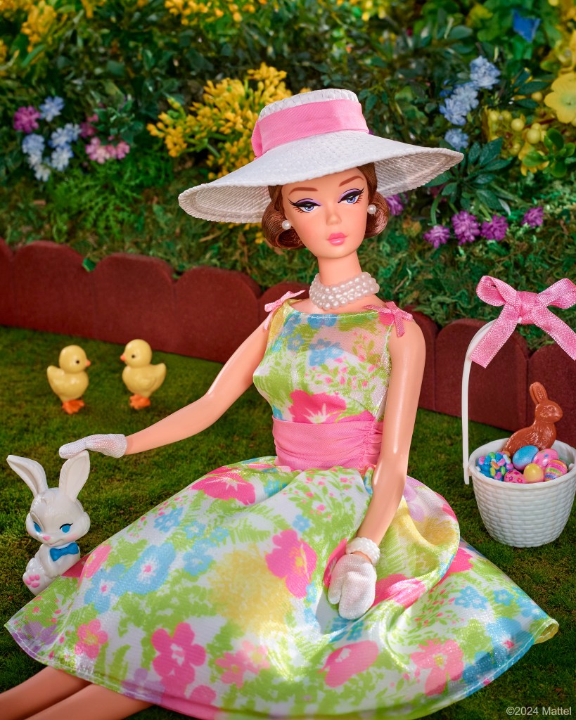 En aquellos años los coleccionistas de Barbie éramos más felices porque no sabíamos que desgraciadamente Bill Greening iba a dejar de trabajar para la empresa juguetera y, quizás por ello, es ahora que veo aún más hermosa esta muñeca que el creó. Esta muñeca de vinilo y estilo vintage homenajea la llegada de la primavera organizando una fiesta en el jardín. ¿Recordáis la Barbie 12 Days of Halloween? Pues lo mismo pero más «alegre». Barbie viene en una caja en forma de huevo (de Pascua) con doce compartimentos llenos de sorpresas… ¡tiene dos outfits!