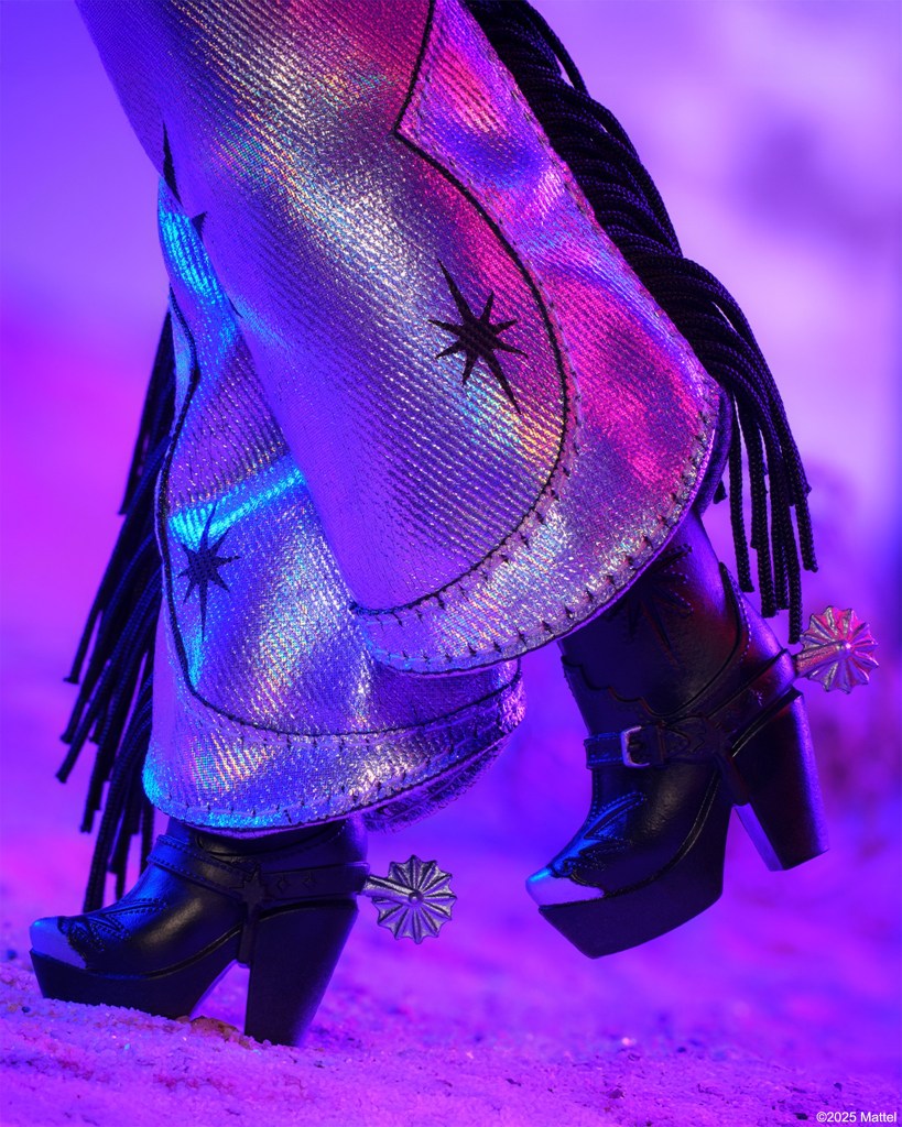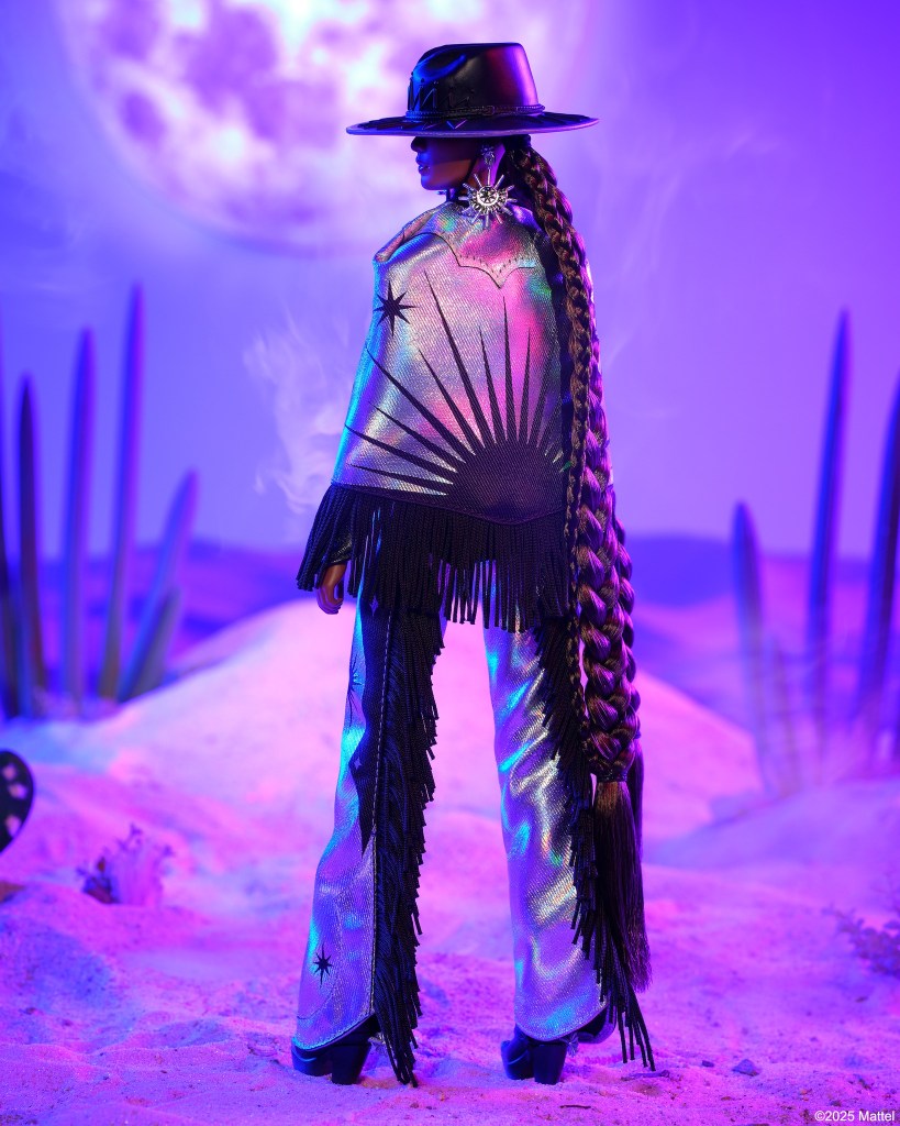 Barbie Fashion Frontier luce un look inspirado en el cielo nocturno con un top de tirantes negro y una capa y chaparreras con flecos en un plateado brillante con estampado de estrellas negras a juego. Lo completa con un cinturón con hebilla, pendientes enormes, mangas de cuero negro y un sombrero de ala ancha.