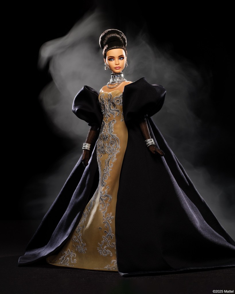 La muñeca Barbie, cuarta en su colección, luce muy elegante en un vestido color nude con bordados en hilo plateado (¿soy yo o se ven las iniciales de la diseñadora?) y unas mangas abullonadas en color negro que caen por detrás en una cola larga haciendo de este look un sueño. Los guantes negros transparentes, las joyas plateadas, el recogido y el maquillaje combinan perfectamente.