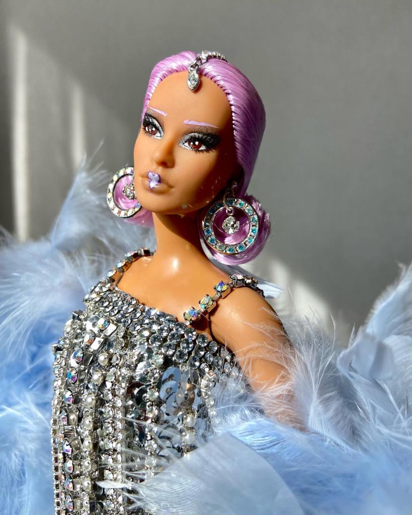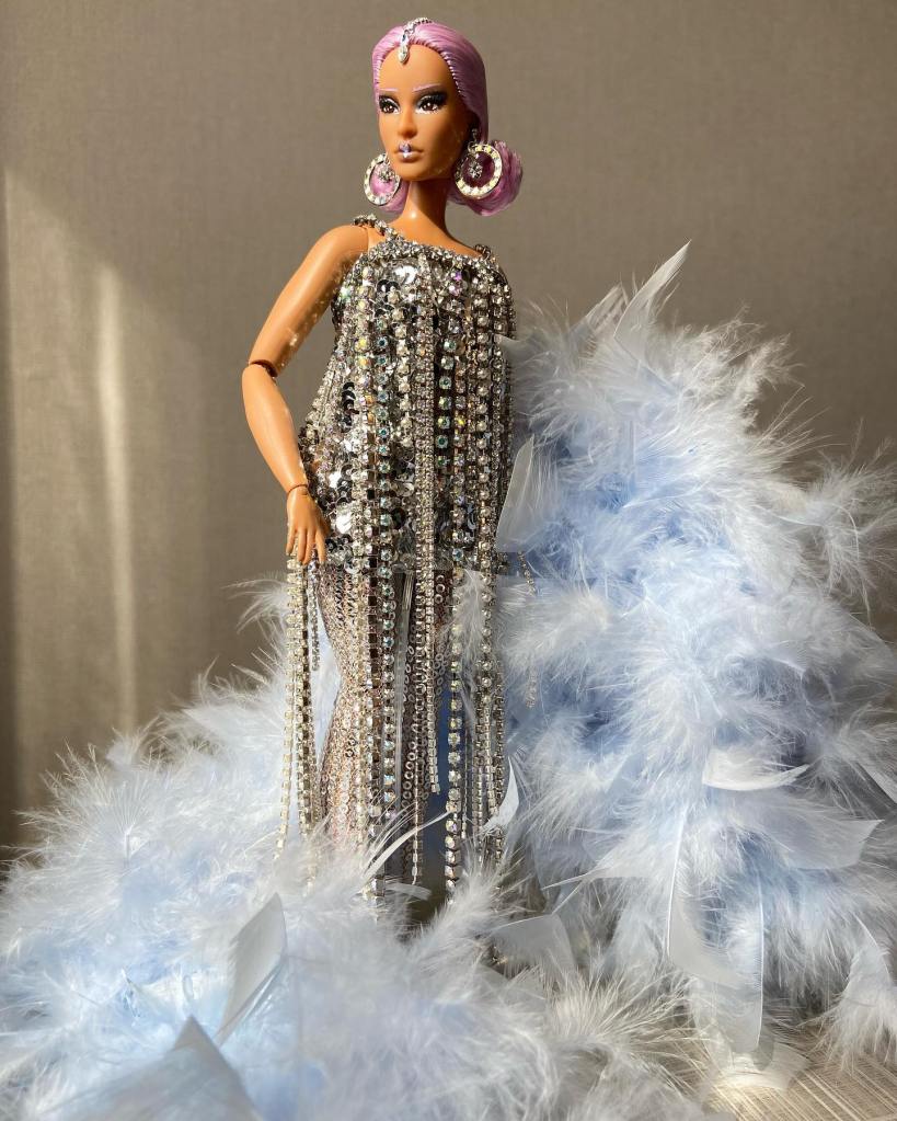 La muñeca tiene todo, lo que a mi parecer seria deseable: flecos, plumas, brillo y el toque de color que no podía faltar en una Barbie de Carlyle. Bellísima. ¿Su nombre? Diamanté Destiny.