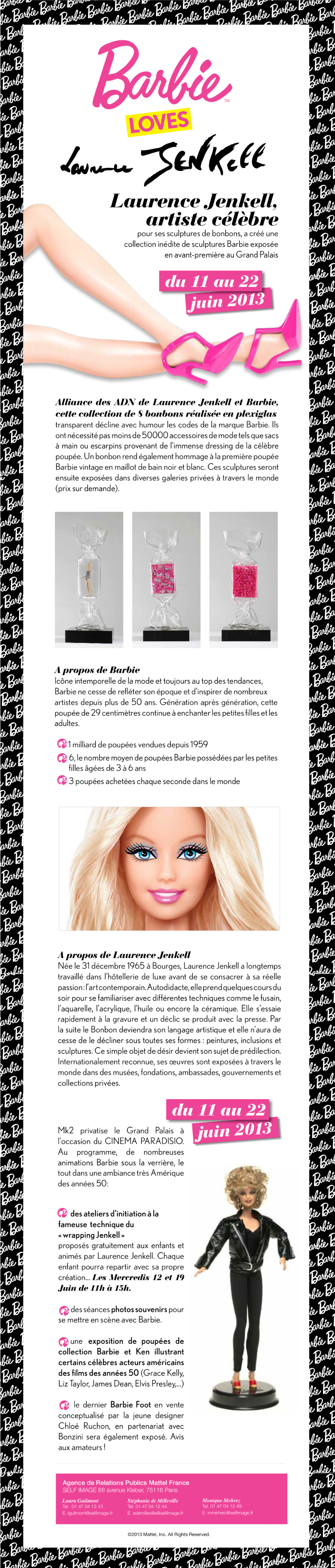 Durante las pasadas semanas del 11 al 22 de junio, la escultora Laurence Jenkell, famosa por sus ‘dulces’ obras, expuso en el Grand Palais de París ocho esculturas únicas inspiradas en Barbie que forman parte de su nueva colección. Las piezas elaboradas con Plexiglas transparte contienen más de 50.000 accesorios, como bolsos o zapatos icónicos del armario interminable de la muñeca más famosa. Como se pueden apreciar en las imágenes, y como ejemplo, un caramelo rinde homenaje a la primera Barbie.
