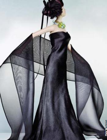 The dress, by Isabelle Marant, is elegant in black with a «châle» in the same colour.