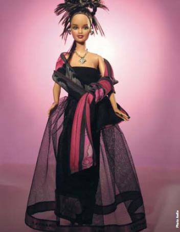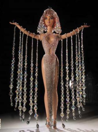 The star of the day is «Barbie Perles de Tahiti», a doll that pretends to be a Goddess of inspiration Cyprus. His whole body is full of jewels, and her dress is embroidered Lesage glass, while the «strings» that hang on his arm are composed by glass Lesage, 24 Tahitian pearls and black pearl. The hair ornament is equally spectacular and luxurious.