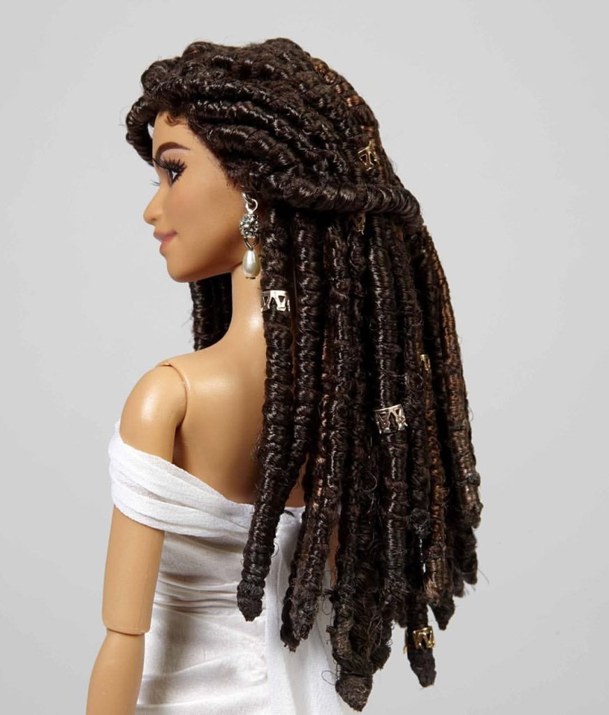 Como os comentaba en el anterior post, la muñeca está inspirada en el look que la actriz, modelo y cantante (y seguro que algo más que me olvido) lució en la pasada edición de los Oscars. El original pelo en rastas fue obra de @theshelbyswain y el precioso vestido es un elegante Vivienne Westwood.