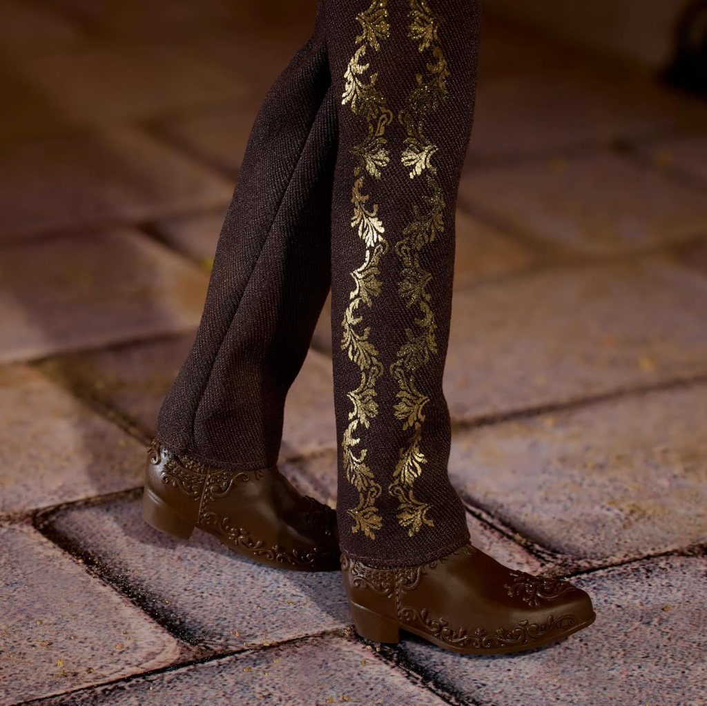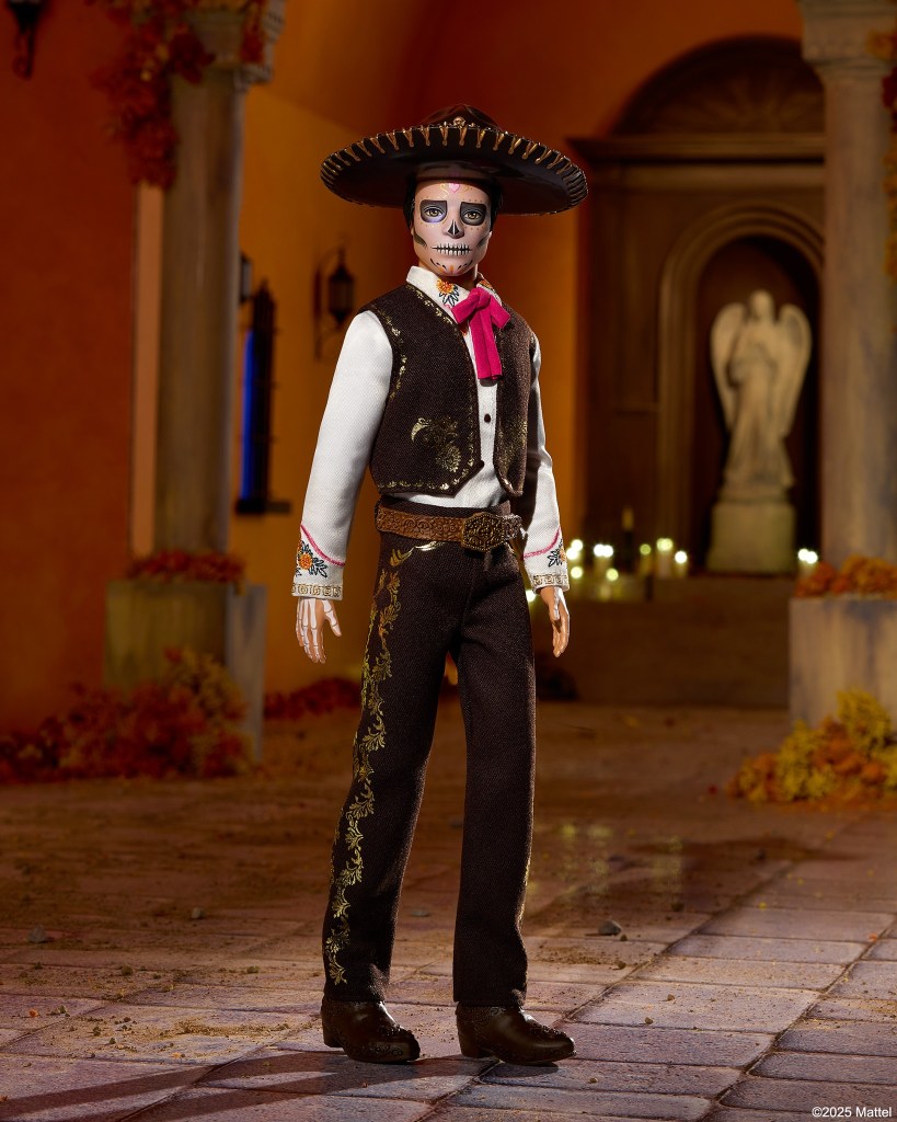 Ken siempre me pareció poco cuidado en esta colección pero, como he dicho antes, este año tiene también detalles que lo mejoran. Lleva traje color crema y negro donde se homenajea igualmente a la flor de cempasúchil en la camisa, El pantalón y el chaleco llevan ribetes dorados. Por otra parte, el sombrero, las botas y el cinturón están muy cuidados más allá de que son de plástico. El maquillaje, por supuesto, está inspirado en una calavera y ¡fijaos en las manos!